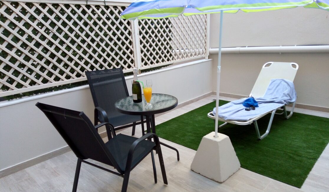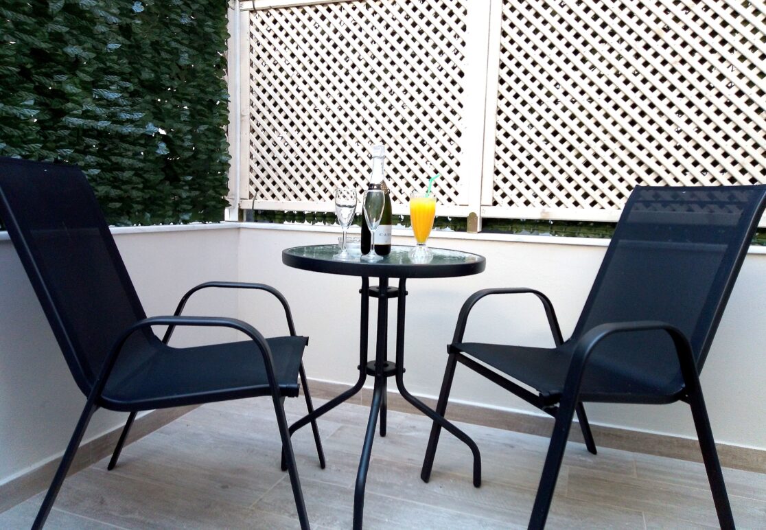 Modern style rooms (15 sqm), with brand new furnitures, can accommodate up to two people. Each room has a comfortable king-size bed (180 cm X 200cm) or two single beds (90cm X 200cm). The rooms have A/C, smart flat TV 32″, bathroom with shower, refridgerator, kettle, hairdryer, and safe deposit box. The rooms are located on the ground floor and have a terrace with outdoor furnishing. The terrace has no view.