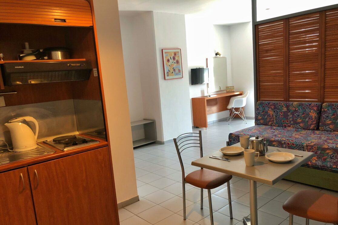 Spacious, cozy studios (33 sqm), above the pool area, can accommodate up to three people. Studios have an open space area with a double bed (or two single beds), an extra single bed and a dining – kitchen corner. Each studio has a balcony overlooking the outdoor swimming pool. Studios are suitable for couples, group of 3 adults or small families.